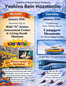 YOSS will be hosting a Mid-Winter Yeshiva Bein Hazmanim for Grades 1–8 on Monday and Tuesday, January 19–20, from 8:45 AM–4:00 PM. Each day includes davening and learning with YOSS Rabbeim, supervised by Rabbi Shlomo Drebin and an experienced staff.