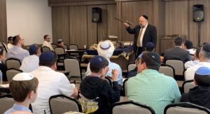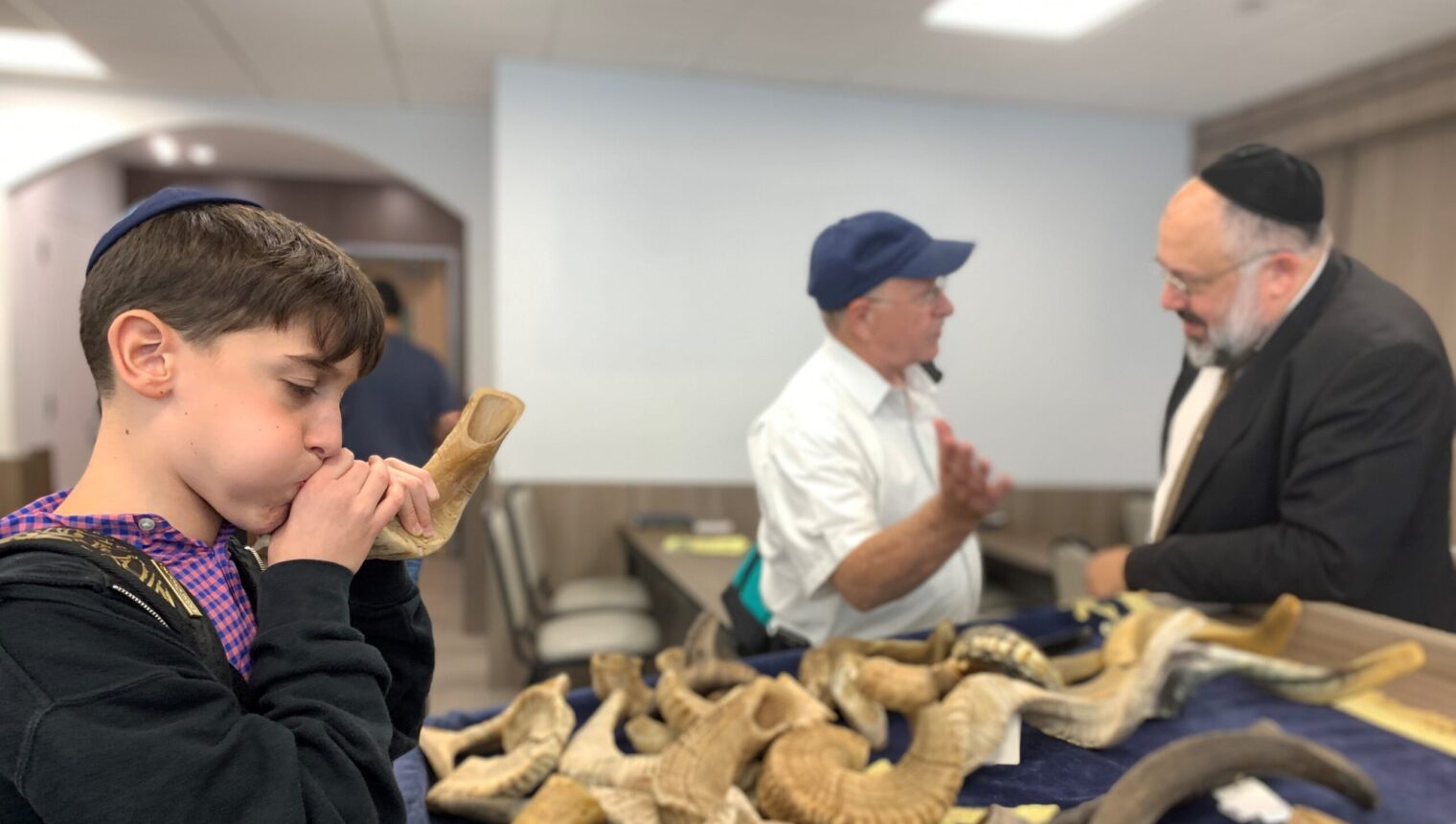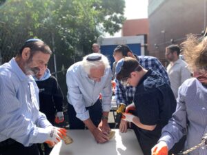 This past Sunday, Rabbi Moshe Shonek, 8th grade Rebbe at YOSS, led a father-son/grandson shofar workshop. The program began with Rabbi Zev Davidowitz, Menahel HaMechina, expounding on the inyan of shofar, then Rabbi Shonek gave a shiur on Hilchos Shofar. Together they learned which animals are kosher for the mitzvah of shofar. Rabbi Shonek brought in horns from rams, kudus, gemsboks, cows and many other kosher animals that may or may not be used as a shofar. Rabbi Shonek, a professional Ba’al Tokea in his own right, demonstrated the different sounds each horn makes and how halach makes an impact of each sound or series of tekios. After his shiur, everyone went outside to make their own Shofar. Each boy received a raw horn, and together with their fathers and grandfathers, they cut, drilled, and sanded it, to create an actual usable shofar – all ready for tekias shofar!